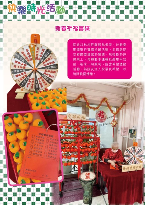快 時 活 快 樂 時 光 活 動 動 樂 光 新春祈福寶碟 新春祈福寶碟 院舍以林村許願節為參考,於新春 期間舉行寶牒祈願活動,並協助院 友將願望填寫於寶牒,然後掛於許 願架上,再轉動幸運輪及敲擊平安 鼓,祈求一切順利。院舍希望透過 活動,為院友注入祝福及希望,以 消除負面情緒。 4 4