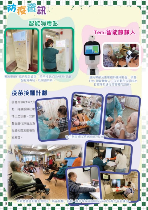 8 8      本院邀請註冊醫生就院友「疫苗接種」計劃,進行視像諮詢服務及為院友進行諮詢講座。