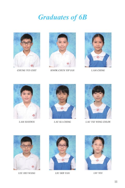 Graduates of 6B CHUNG YUI CHIT KWOK CHUN YIP IAN LAM CHING LAM HAYDEN LAU KA CHING LAU TSZ WING CHLOE LEE HEI WANG LIU HOI YAN LIU YEE 11