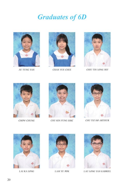 Graduates of 6D AU TUNG YAN CHAN YUE CHEE CHIU TIN LONG SKY CHOW CHUNG CHU KIN FUNG ERIC CHU TSZ HO ARTHUR LAI KA LONG LAM YU POK LAU LONG YAN GABRIEL 20