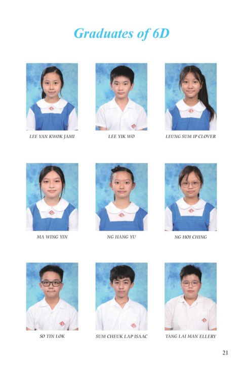 Graduates of 6D LEE YAN KWOK JAMI LEE YIK WO LEUNG SUM IP CLOVER MA WING YIN NG HANG YU NG HOI CHING SO TIN LOK SUM CHEUK LAP ISAAC TANG LAI MAN ELLERY 21