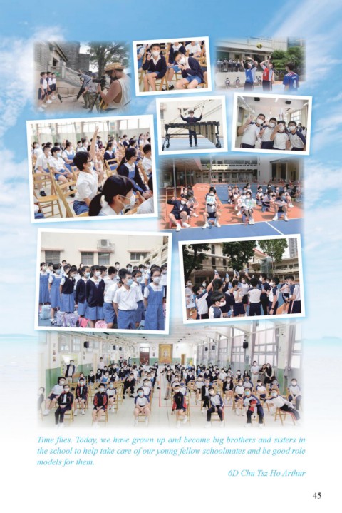 Time flies. Today, we have grown up and become big brothers and sisters in the school to help take care of our young fellow schoolmates and be good role models for them. 6D Chu Tsz Ho Arthur 45