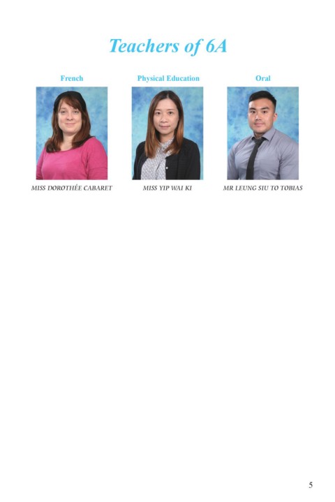 Teachers of 6A French Physical Education Oral MISS DOROTHÉE CABARET MISS YIP WAI KI MR LEUNG SIU TO TOBIAS 5