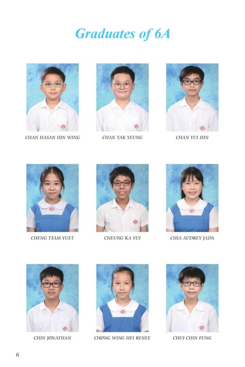 Graduates of 6A CHAN HASAN HIN WING CHAN TAK YEUNG CHAN YUI HIN CHENG TSAM YUET CHEUNG KA YUI CHIA AUDREY JADA CHIN JONATHAN CHONG WING HEI RENEE CHUI CHIN FUNG 6