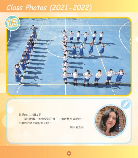 Class Photos (2021-2022) 1E 親愛的1E小朋友們: 願你們像一顆顆堅韌的種子,勇敢地衝破泥沙, 用嫩綠的幼芽擁抱藍天吧! 饒雨晴老師 14