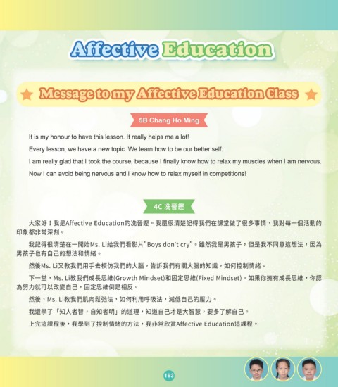 上完這課程後,我學到了控制情緒的方法,我非常欣賞Affective Education這課程。