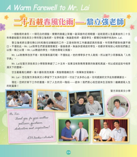 Mr. Lai,您在聖方濟各英文小學留下了太多的足印,付出了太多的心血,任何感謝的文字此刻都顯蒼白。
