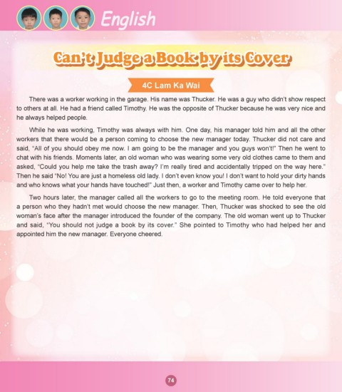 and said, “You should not judge a book by its cover.” She pointed to Timothy who had helped her and