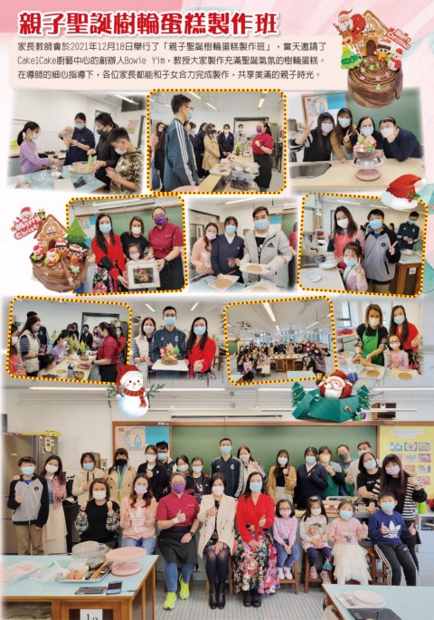 親子聖誕樹輪蛋糕製作班 親子聖誕樹輪蛋糕製作班 家長教師會於2021年12月18日舉行了「親子聖誕樹輪蛋糕製作班」,當天邀請了 Cake1Cake廚藝中心的創辦人Bowie Yim,教授大家製作充滿聖誕氣氛的樹輪蛋糕。 在導師的細心指導下,各位家長都能和子女合力完成製作,共享美滿的親子時光。