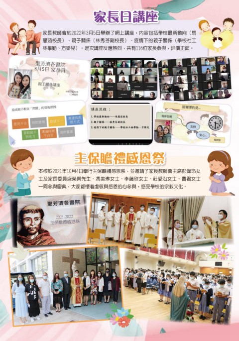 家長日講座 家長日講座 家長教師會於2022年3月5日舉辦了網上講座,內容包括學校最新動向(馬 慧茹校長)、親子關係(林秀芬副校長)、疫情下的親子關係(學校社工 林學勤、方樂兒)。是次講座反應熱烈,共有116位家長參與,評價正面。 主保瞻禮感恩祭 主保瞻禮感恩祭 本校於2021年10月4日舉行主保瞻禮感恩祭,並邀請了家長教師會主席彭偉玲女 士及家長委員盛榮興先生、馮美琳女士、李藹欣女士、莊愛治女士、曹君女士 一同參與慶典,大家都懷着虔敬與感恩的心參與,感受學校的宗教文化。