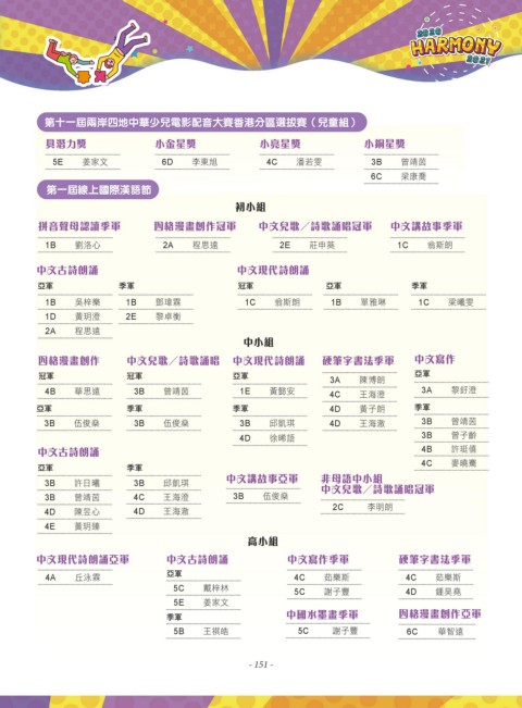 拼音聲母認讀季軍 四格漫畫創作冠軍 中文兒歌/詩歌誦唱冠軍 中文講故事季軍