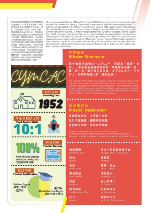 本校因著辦學團體香港中華基督教青 Our sponsoring body Chinese YMCA of Hong Kong (YMCA) has a strong international network, which