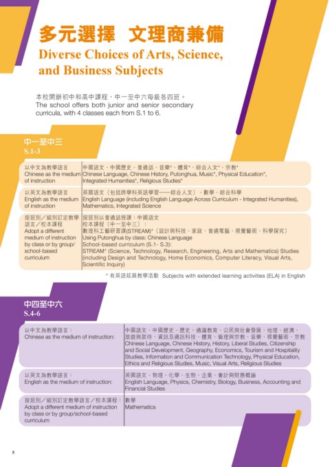 以中文為教學語言 中國語文、中國歷史、普通話、音樂*、體育*、綜合人文*、宗教*