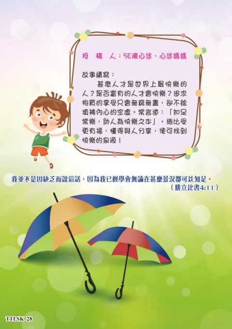 投 稿 人:5E陳心悠、心悠媽媽 故事續寫: 甚麼人才是世界上最快樂的 人?是否富有的人才會快樂?追求 物質的享受只會無窮無盡,卻不能 填補內心的空虛。常言道:「知足 常樂,助人為快樂之本」。施比受 更有福,懂得與人分享,便可找到 快樂的泉源! 我並不是因缺乏而說這話,因為我已經學會無論在甚麼景況都可以知足。 我並不是因缺乏而說這話,因為我已經學會無論在甚麼景況都可以知足。 (腓立比書4:11) (腓立比書4:11) TTLSK 28 TTLSK 28