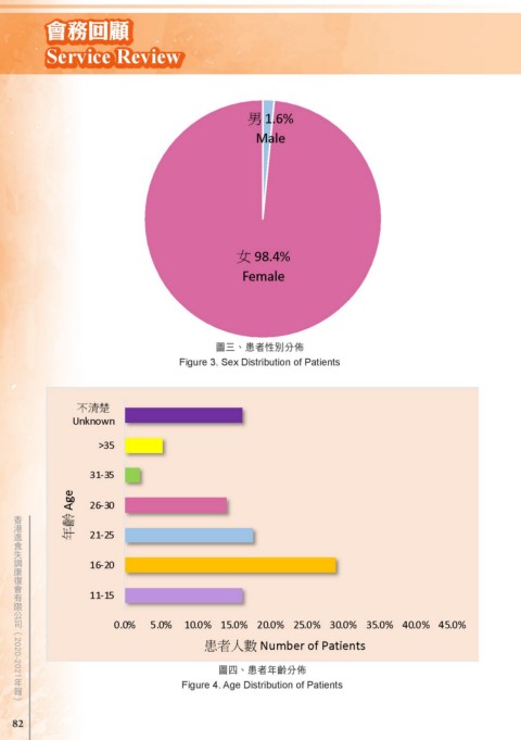 會務回顧 Service Review 圖三、患者性別分佈 圖三、患者性別分佈 Figure 3. Sex Distribution of Patients Figure 3. Sex Distribution of Patients 香港進食失調康復會有限公司 ( 圖四、患者年齡分佈 圖四、患者年齡分佈 2020-2021 年報) Figure 4. Age Distribution of Patients Age Distribution of Patients Figure 4. 82