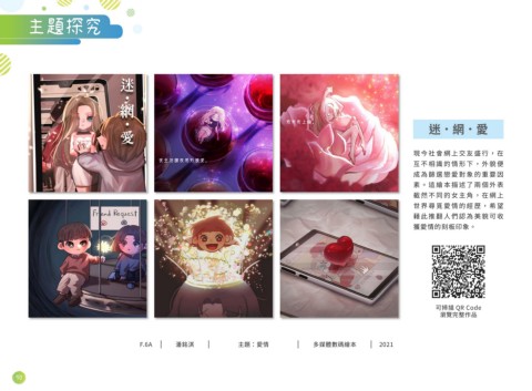 主題探究 迷.網.愛 現今社會網上交友盛行,在 互不相識的情形下,外貌便 成為篩選戀愛對象的重要因 素。這繪本描述了兩個外表 截然不同的女主角,在網上 世界尋覓愛情的經歷,希望 藉此推翻人們認為美貌可收 獲愛情的刻板印象。 可掃描 QR Code 瀏覽完整作品 F.6A 潘銘淇 主題:愛情 多媒體數碼繪本 2021 50