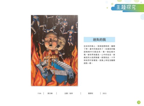 主題探究 迷失的我 在信仰的路上,我曾經歷跌倒,離開 了神。畫中的我迷失了,在痛苦的輪 迴階梯中行屍走肉,像一個扯線木 偶,被世界拖着走。心中的信念,被 痛苦的火焰燃燒着。縱使如此,十字 架依然佇侯著我,就像上帝從沒離開 過我一樣。 F.6A 張文峰 主題:信仰 塑膠彩 2021 51