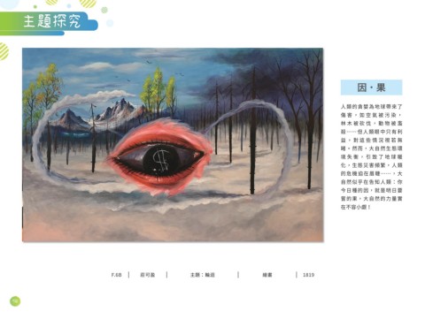 主題探究 因.果 人類的貪婪為地球帶來了 傷害,如空氣被污染, 林木被砍伐,動物被濫 殺……但人類眼中只有利 益,對這些情況視若無 睹。然而,大自然生態環 境失衡,引致了地球暖 化,生態災害頻繁,人類 的危機迫在眉睫……,大 自然似乎在告知人類:你 今日種的因,就是明日要 嘗的果,大自然的力量實 在不容小覷! F.6B 莊可盈 主題:輪迴 繪畫 1819 54