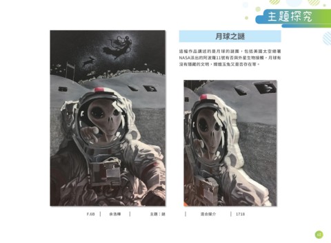 主題探究 月球之謎 這幅作品講述的是月球的謎團,包括美國太空總署 NASA派出的阿波羅11號有否與外星生物接觸,月球有 沒有隱藏的文明,嫦娥玉兔又是否存在等。 F.6B 余浩樺 主題:謎 混合媒介 1718 63