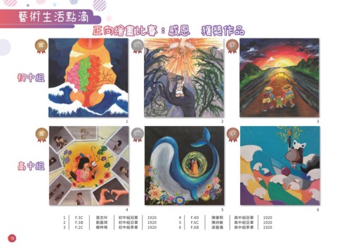 藝術生活點滴 正向繪畫比賽:感恩 獲獎作品 冠 亞 季 初中組 1 2 3 冠 亞 季 高中組 4 5 6 1 F.3C 張志玲 初中組冠軍 1920 4 F.4D 陳肇熙 高中組冠軍 1920 2 F.3B 劉嘉琪 初中組亞軍 1920 5 F.6C 陳詩敏 高中組亞軍 1920 3 F.2C 鄉梓晴 初中組季軍 1920 6 F.6B 梁嘉儀 高中組季軍 1920 78