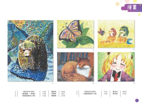 繪畫 2 3 1 4 5 1 《奇妙的大自然》 F.2A 羅喜悅 1819 4 《奇妙的大自然》 F.2C 張志玲 1819 2 《點描畫 動物》 F.2A 余學昕 1617 5 《我最喜愛的人物》 F.2D 廖芬綺 1718 3 《我最喜愛的人物》 F.2A 陳肇熙 1718 7