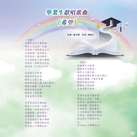 77 畢業生獻唱歌曲裏 今 天 我 就 是 日 後 小 棟 樑。 快 完 成 心 中 種 種 志 向,