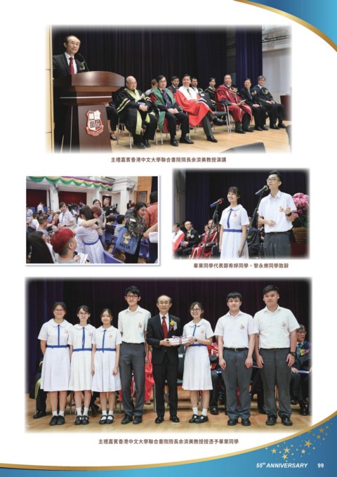 主禮嘉賓香港中文大學聯合書院院長余濟美教授演講 畢業同學代表鄭希婷同學、黎永樂同學致辭 主禮嘉賓香港中文大學聯合書院院長余濟美教授授憑予畢業同學 th 55 ANNIVERSARY 99