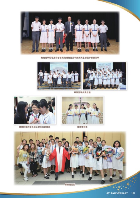 教育局學校發展分部首席助理秘書長李錦光先生授憑予畢業同學 畢業同學代表獻唱 畢業同學向家長送上鮮花以謝親恩 畢業禮剪影 畢業禮剪影 th 55 ANNIVERSARY 101