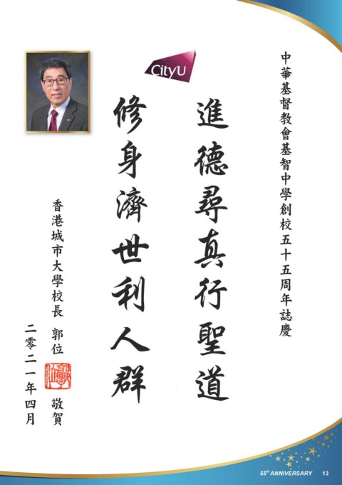五 十 創 校 五 誌 慶 周 年 學 學 中 智 創 十 五 校 基 華 中 督 基 會 教 教 督 基 會 中 智 基 年 周 五 誌 華 中 慶 大 學 香 市 城 港 校 長 一 年 二 二 零 四 月 郭 位 賀 敬 th 55 ANNIVERSARY 13