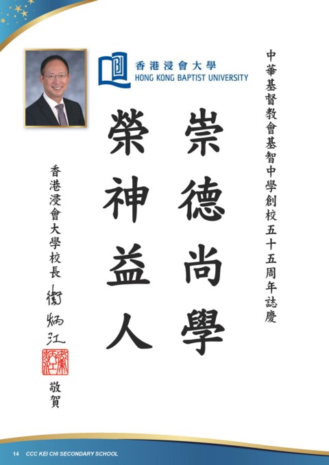 慶 誌 基 中 華 年 基 智 中 督 教 會 學 十 五 周 創 校 五 中 華 基 督 榮 崇 教 會 學 大 香 港 浸 長 校 會 基 智 神 德 中 學 五 十 益 尚 五 香 週 港 年 校 浸 人 學 慶 會 大 學 校 長 敬 賀 賀 敬 14 CCC KEI CHI SECONDARY SCHOOL