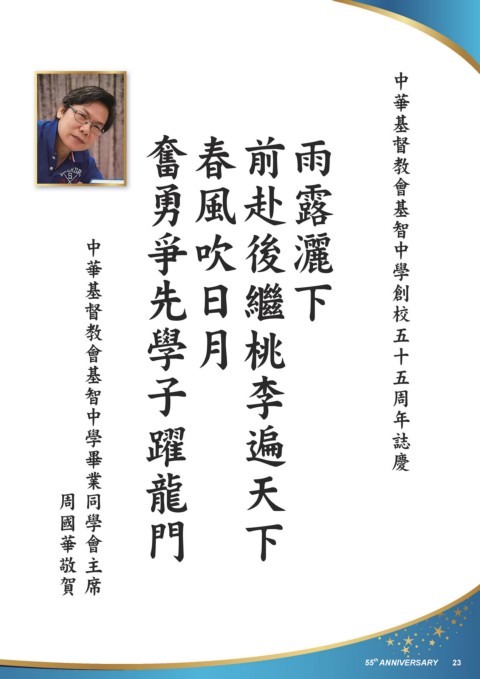 基 會 中 智 教 華 中 督 基 學 年 周 慶 誌 五 校 創 十 五 先 學 爭 勇 奮 子 門 龍 躍 吹 風 春 日 月 前 桃 赴 後 繼 李 天 下 遍 下 雨 露 灑 同 業 畢 學 席 主 會 督 教 基 中 華 中 學 智 會 基 國 周 華 賀 敬 th 55 ANNIVERSARY 23