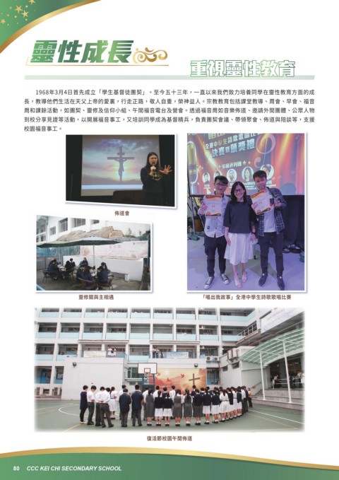 長,教導他們生活在天父上帝的愛裏,行走正路,敬人自重,榮神益人。宗教教育包括課堂教導、周會、早會、福音