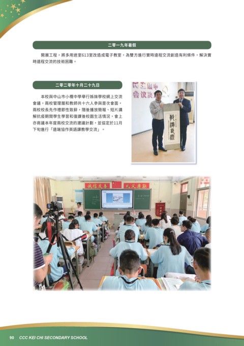 二零一九年暑假 開展工程,將多用途室613室改造成電子教室,為雙方進行實時遠程交流創造有利條件,解決實 時遠程交流的技術困難。 二零二零年十月二十九日 本校與中山市小欖中學舉行姊妹學校網上交流 會議,兩校管理層和教師共十六人參與是次會面, 兩校校長先作禮節性致辭,隨後播放簡報、短片講 解抗疫期間學生學習和復課後校園生活情況,會上 亦商議本年度兩校交流的建議計劃,並協定於11月 下旬進行「遠端協作英語課教學交流」。 90 CCC KEI CHI SECONDARY SCHOOL