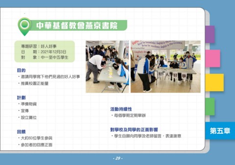 中華基督教會燕京書院 專題研習:好人好事 日 期:2021年12月3日 對 象:中一至中五學生 目的 .邀請同學寫下他們見過的好人好事 .推廣校園正能量 計劃 .準備物資 活動持續性 .宣傳 .每個學期定期舉辦 .設立攤位 對學校及同學的正面影響 回饋 第五章 .學生自願向同學及老師留言,表達謝意 .大約60位學生參與 .參加者的回應正面 - 29 - - 29 -