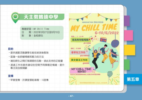 天主教鳴遠中學 專題研習:MY Chill Time 日 期:2022年5月27日至6月10日 對 象:全校師生 目的 .提供減壓活動讓學生能在統測後鬆弛 .認識一些舒緩情緒和壓力的方法 .增加師生之間打氣關愛的互動、彼此支持的正能量 .透過工作坊提供適切的空間予同學穩定情緒、提升 專注及自我關顧 宣傳 .早會宣傳、於課室張貼海報、IG宣傳 第五章 43 - - 43 - -