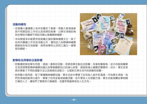 .本校期望來年能更有效推廣正面的精神健康文化,除了
