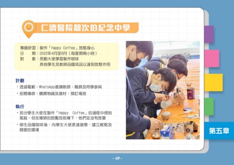 仁濟醫院靚次伯紀念中學 專題研習:製作「Happy Coffee」放鬆身心 日 期:2022年4月至6月(每星期兩小時) 對 象:思動大使學習製作咖啡 其他學生及教師品嚐成品以達到放鬆作用 計劃 .透過電郵、WhatsApp邀請教師、職員及同學參與 .招聘導師、購買物資及器材、預訂場地 執行 .部分學生大使在製作「Happy Coffee」的過程中感到 氣餒,但在導師的鼓勵及指導下,他們並沒有放棄 .師生品嚐咖啡後,向學生大使表達謝意,建立輕鬆及 關愛的環境 第五章 - 49 - - 49 -