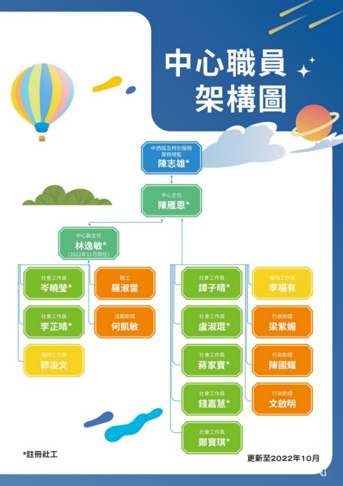 中⻄區及特別服務 服務總監 陳志雄* 中心主任 陳雁恩* 中心副主任 林逸敏* (2022年11月到任) 社會工作員 職工 社會工作員 福利工作員 岑曉瑩* 羅淑雲 譚子晴* 李福有 社會工作員 活動助理 社會工作員 行政助理 李芷晴* 何凱敏 盧淑琨* 梁紫媚 福利工作員 社會工作員 行政助理 郭浚文 蔣家寶* 陳國耀 社會工作員 行政助理 錢嘉慧* 文啟明 社會工作員 鄭寶琪* *註冊社工 更新至2022年10月 4 4
