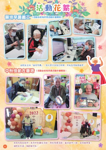 活 動 花 絮 晉培早晨義工 (活動由老有所為活動計劃贊助) 由院友主持「晉培早晨」,與大家分享當日新聞、天氣及懷舊歌曲等。 中秋佳節在晉培 (活動由老有所為活動計劃贊助) 本院為院友提供一系列中秋慶祝活動,例如集體活動、藝術創作小組、享用美食等, 6 讓院友共渡一個歡樂中秋。
