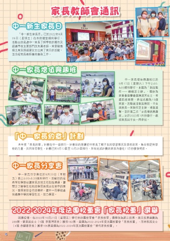 本年度「家長約章」計劃在中一級推行,計劃目的是讓初中家長了解子女的學習情況及學校政策,集合家庭與學