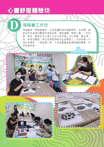 心靈舒壓體驗坊 D 禪繞畫工作坊 禪繞畫工作坊 禪繞畫是一種療癒藝術,主要是讓參加者繪畫簡單、有結構、麻 麻密密而重複的圖案中慢慢放鬆,繼而減壓,療癒心靈。一枝針 筆一張紙,畫家就可以專注在自己的思緒上加以發揮,產生獨一 無二的美與驚喜。參加者把精神集中在紙跟筆上,忘卻周遭一切 煩心的事物,一筆接著一筆,只是重複畫著幾個同樣的圖案,但 是非常紓壓。 12 12