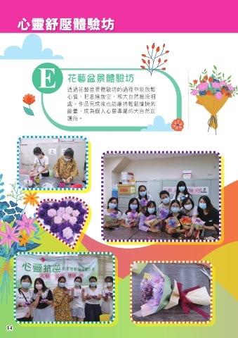 心靈舒壓體驗坊 E 花藝盆景體驗坊 花藝盆景體驗坊 透過花藝盆景體驗坊的過程中能放鬆 心情,把思緒放空,和大自然融洽相 處。作品完成後也能維持輕鬆愉快的 能量,成為個人心靈專屬的大自然庇 護所。 14 14