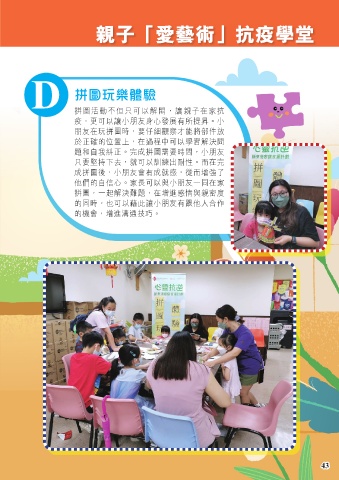 親子「愛藝術」抗疫學堂 D 拼圖玩樂體驗 拼圖玩樂體驗 拼圖活動不但只可以解悶,讓親子在家抗 疫,更可以讓小朋友身心發展有所提昇。小 朋友在玩拼圖時,要仔細觀察才能將部件放 於正確的位置上,在過程中可以學習解決問 題和自我糾正。完成拼圖需要時間,小朋友 只要堅持下去,就可以訓練出耐性。而在完 成拼圖後,小朋友會有成就感,從而增強了 他們的自信心。家長可以與小朋友一同在家 拼圖,一起解決難題,在增進感情與親密度 的同時,也可以藉此讓小朋友有跟他人合作 的機會,增進溝通技巧。 43 43