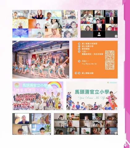 10 11 10 網上管樂分部練習 11 網上弦樂分部 12 藝術體操 13 片段一: 體藝展潛能•活出正能量 14 片段二: You Raise Me Up 15 - 16 網上體藝活動 12 13 14 15 16 P18 P18