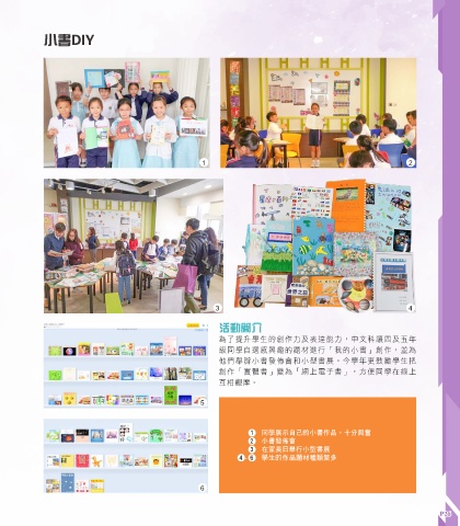 小書DIY 小書DIY 1 2 3 4 活動簡介 為了提升學生的創作力及表達能力,中文科讓四及五年 級同學自選感興趣的題材進行「我的小書」創作,並為 他們舉辦小書發佈會和小型書展。今學年更鼓勵學生把 創作「實體書」變為「網上電子書」,方便同學在線上 互相觀摩。 5 1 同學展示自己的小書作品。十分興奮 2 小書發佈會 3 在家長日舉行小型書展 4 - 6 學生的作品題材種類繁多 6 P26 P26