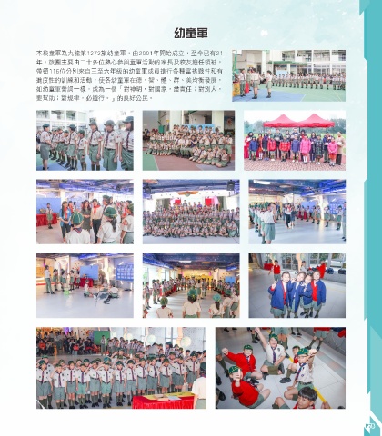 幼童軍 幼童軍 本校童軍為九龍第1272旅幼童軍,由2001年開始成立,至今已有21 年。旅團主要由二十多位熱心參與童軍活動的家長及校友擔任領袖, 帶領116位分別來自三至六年級的幼童軍成員進行各種富挑戰性和有 進度性的訓練和活動,使各幼童軍在德、智、體、群、美均衡發展, 如幼童軍誓詞一樣,成為一個「對神明,對國家,盡責任;對別人, 要幫助;對規律,必遵行。」的良好公民。 P78 P78