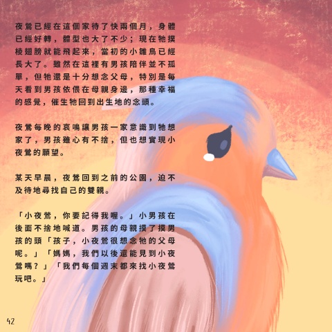 告 別 男 孩 後 , 夜 鶯 ⼀ 直 在 尋 找 牠 的 ⽗ ⺟ , 但 ⾶ 遍 了 整 個 公 園 都 沒 找 到 。 時 間
