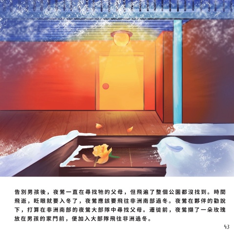 下 , 打 算 在 ⾮ 洲 南 部 的 夜 鶯 ⼤ 部 隊 中 尋 找 ⽗ ⺟ 。 遷 徙 前 , 夜 鶯 擷 了 ⼀ 朵 玫 瑰