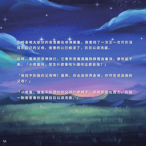 這 時 , ⾵ 來 到 ⾮ 洲 旅 ⾏ 。 它 看 到 夜 鶯 遠 離 族 群 獨 ⾃ 垂 淚 , 便 停 留 下 很 美 , ⻑ 滿 了 玫 瑰 , 滿 天 的 星 星 , 那 裡 的 ⼈ 們 有 的 每 天 都 很 開 ⼼ , 但
