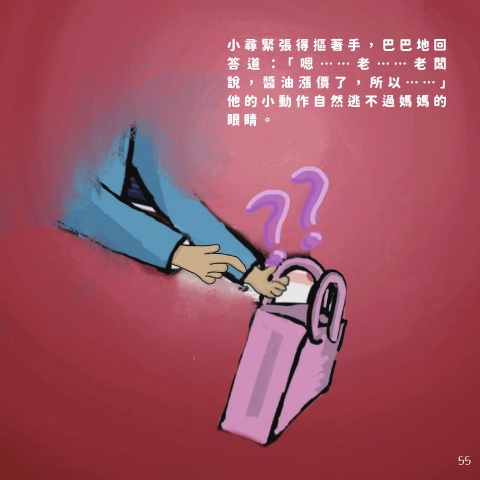 小 尋 緊 張 得 摳 著 手 , 巴 巴 地 回 答 道 : 「 嗯 … … 老 … … 老 闆 說 , 醬 油 漲 價 了 , 所 以 … … 」 他 的 小 動 作 自 然 逃 不 過 媽 媽 的 眼 睛 。 55
